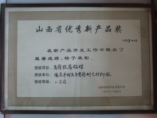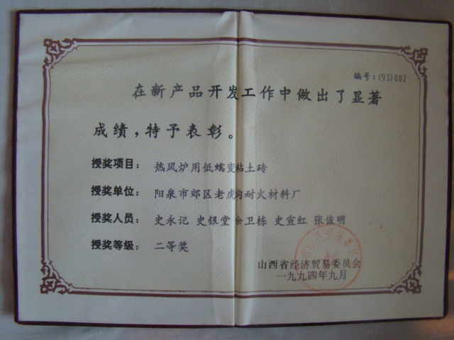 熱風爐用低蠕變高鋁磚、高荷軟高鋁磚獲省科技進步二等獎,微膨脹高鋁磚列入火炬計劃項目,炭素焙燒爐用特種高鋁磚已批準國家專利